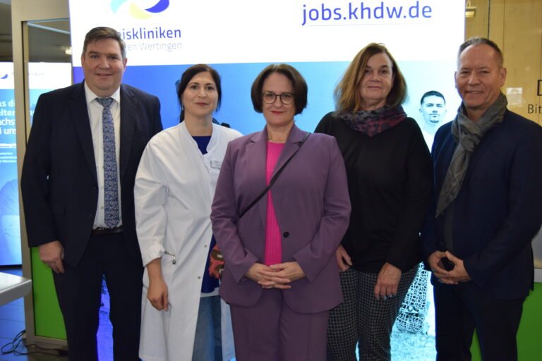 Und das im wahrsten Wortsinn: Die Interessierten erhielten Krankenhausführungen, Türen zu Patientenzimmer und Arbeitsräumen wurden geöffnet, Behandlungsmethoden demonstriert und Gerätschaften erklärt. Eigens für die kleinen Besucherinnen und Besucher wurden auch Kinderführungen durch das Haus angeboten. Viele weitere medizinische Einrichtungen, Betriebe und Vereine, wie das Bayerische Rote Kreuz, der „Verein der Freunde des Krankenhauses Wertingen e.V.“, die „Seniorengemeinschaft Wertingen-Buttenwiesen e.V.“ sowie die dem Haus angeschlossene Pflegeschule, informierten die Frauen und Männer, die zum Tag der offenen Tür ins Krankenhaus kamen. Auch Essen und Trinken wurde durch Helfer wie den Verein „Freunde der Zusaminsel“ und dem zukünftigen Caterer der Kreiskliniken, der „Hinterland Gastro GmbH“ aus Gundelfingen, übernommen. Um Unterstützung der Bevölkerung für die beiden Kreisklinken bat – wie schon öfter in der Vergangenheit – Wertingens Bürgermeister Willy Lehmeier: „Normalerweise bleiben am Ende einer Insolvenz die Türen geschlossen, bei uns ist es auch dank der vielen Macher und der Engagierten in den beiden Kliniken anders.“ Sie alle würden zu einhundert Prozent ihren Job machen. Nicht nur deshalb könnten die Besucherinnen und Besucher an diesem Tag durch offene Türen ins Krankenhaus eintreten. „Damit das so bleibt, müssen die Menschen die Angebote der beiden Klinken dann auch nutzen, damit die Türen weiter offen bleiben können.“ Außerdem bat der Bürgermeister, „unseren Krankenhausförderverein zu unterstützen.“ Denn dieser Verein trage zum Erhalt des Wertinger Hauses tatkräftig bei. Auch Landrat Markus Müller ließ es sich nicht nehmen, sein Vertrauen in die Kreiskliniken durch eindringliche Begrüßungsworte zu unterstreichen: „Es sind sehr herausfordernde Zeiten und wir alle, die Politik, die Krankenhausgeschäftsführung, das Personal sowie die Bürger sind Teil der Lösung.“ Es komme auf viele Mitwirkende und Unterstützer an. Er sprach den jüngst gefassten Kreisratsbeschluss der „Durchfinanzierung“ an, um das Insolvenzverfahren in den kommenden Monaten verlassen zu können. Man wolle das medizinische Angebot für die Menschen zukunftsfähig gestalten. Hier zählte der Landrat nicht nur den Aufbau einer umfangreichen Geriatrie in Wertingen auf, sondern sprach auch neben der Inneren Medizin von, „einer Einrichtung einer ambulanten Anlaufstelle für kleinere Notfälle.“ Denn man registriere, dass die Menschen in Wertingen gerade das Fehlen derselben beklagen.