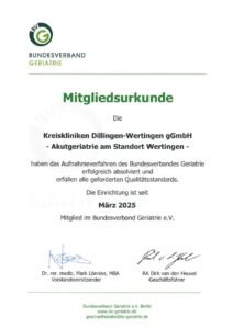Wertingen Die Kreisklinken Dillingen-Wertingen gGmbH mit der Akutgeriatrie am Standort Wertingen wurde nun offiziell in den Bundesverband Geriatrie e.V. aufgenommen. Damit gehört die Einrichtung nun einem bundesweiten Netzwerk von Fachkliniken und Einrichtungen an, die sich der qualitativ hochwertigen Versorgung älterer Menschen widmen. Diese Mitgliedschaft ist ein bedeutender Meilenstein und unterstreicht die hohe Qualität der geriatrischen Versorgung am Standort Wertingen. Sie zeigt, dass sich die Kreiskliniken nicht nur der medizinischen, sondern auch der menschlichen Betreuung älterer Menschen in besonderer Weise verpflichtet fühlt.