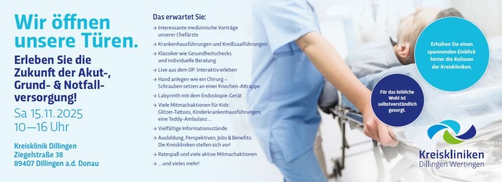 In bewegten Zeiten schlagen wir gemeinsam ein neues Kapitel auf: Am Samstag, den 15. November 2025 von 10 – 16 Uhr, laden wir an der Kreisklinik Dillingen, Ziegelstraße 38, 89407 Dillingen a.d.Donau alle Bürgerinnen und Bürger, Partner, Freunde und Interessierten herzlich zum Tag der offenen Tür ein.